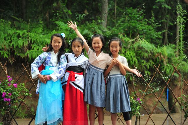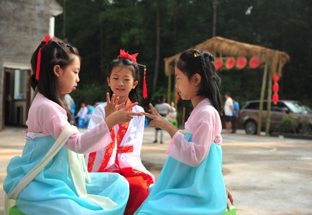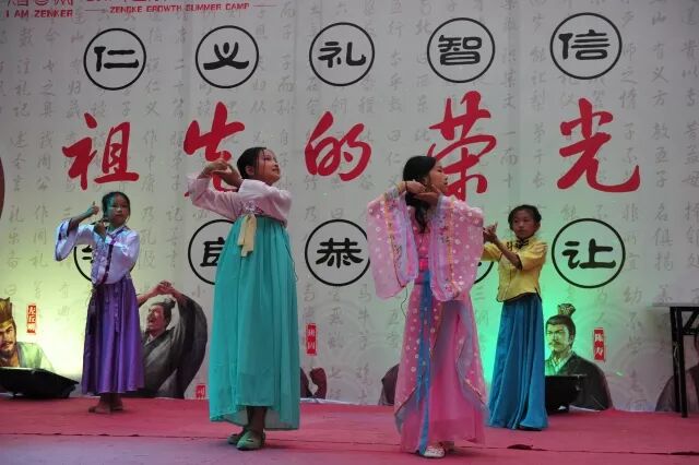 晚上:穿汉服表演话剧《祖先的荣耀》——对许多孩子来说这是他们的第一次登台演出,也是对传统孝道、智慧、勤勉等文化的另类演绎